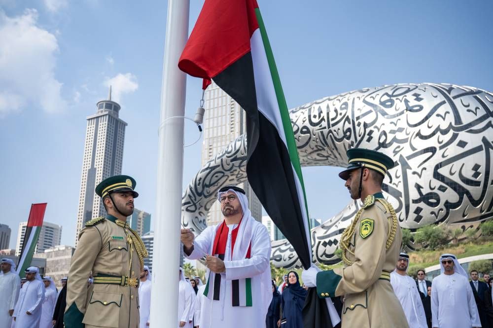 رفع محمد القرقاوي، وزير شؤون مجلس الوزراء، علم دولة الإمارات أمام متحف المستقبل، بمشاركة قيادات وزارة شؤون مجلس الوزراء والمجلس التنفيذي لإمارة دبي ومتحف المستقبل ومؤسسة دبي للمستقبل والمكتب التنفيذي، احتفاءً بيوم العلم وتجسيداً لمعاني الوحدة والانتماء والاعتزاز بالهوية الوطنية.